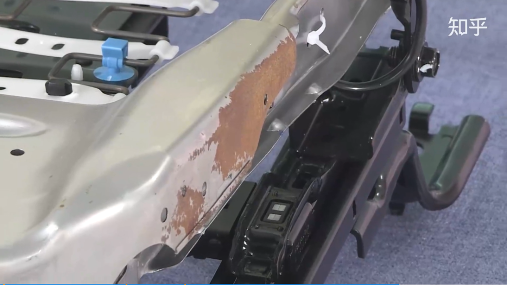 座椅骨架之所以不做防锈要求,一方面是因为骨架是非外漏零件,美观度要求较低。另一方面,座椅骨架上还会包覆发泡材料和皮革,虽然不是完全密封,但相比底盘、车身,座椅骨架所处的环境较为封闭和干燥,不易出现生锈,除非是遇到车辆泡水这种极端情况。与此同时,李建华还表示:“从知乎的视频和图片来看,这块锈迹面积虽大,但还远远没有影响到骨架的强度和功能。”