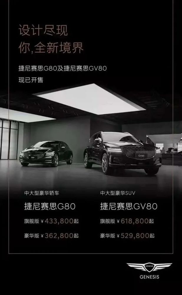 打铁趁热,7月26日,捷尼赛思宣布旗下中大型轿车G80、中大型SUV GV80正式在中国上市,两款车型指导售价区间分别为36.28万-43.38万元、52.98万-61.88万元。