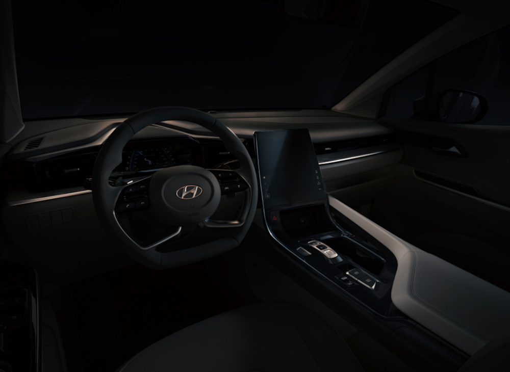 北京现代同时亮相了这款车型的内饰设计,前排采用隔断式设计,中央扶手箱位置相当宽大,而且按钮换挡区域下方进行了镂空设计,可以进一步拓展腿部空间以及储物空间,台面上则是液晶仪表盘搭配竖屏导航屏幕,比GL8科幻。