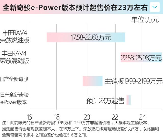 根据规划,日产全新的1.2L e-POWER技术将在今年下半年引入到东风日产轩逸上。除此之外,日产还会推出1.5T与e-Power混动系统的组合,并会率先应用在搭载VC-TURBO 1.5T发动机的全新奇骏上,预计会在明年正式进入市场。e-Power版本的出现将填补奇骏在混动领域的空白,其定位会与丰田/本田的油电混动相类似,如此一来售价也会有所上调。结合此前全新奇骏1.5T版本19.99万元、21.99万元的预售价,以及参考丰田/本田燃油版与混动版差价来看,预计e-Power版本的全新奇骏起售价会在23万元左右。