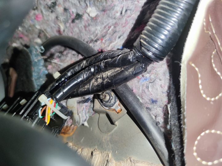 中控侧面有块饰板,拆开之后可以直观的看到里面,内部的搭铁线有拆卸生锈的情况,线束内部也有泥沙附着。