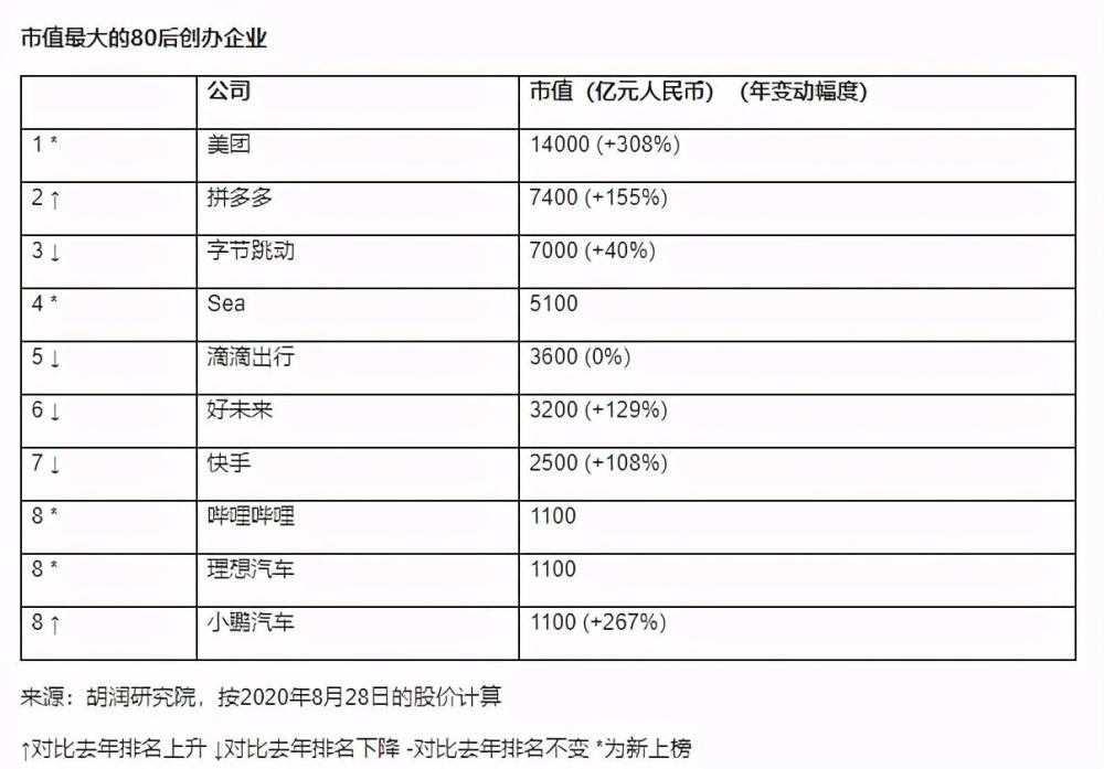 69位80后的平均年龄37岁,比去年大一岁。他们创造了10家千亿级企业,以美团为首,市值达1.4万亿;其次为拼多多和字节跳动,分别为7400亿和7000亿。新能源汽车领域,理想汽车和小鹏汽车各以1100亿的市值进入前十行列。