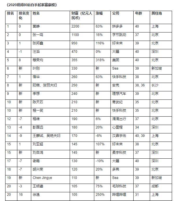 值得关注的是,黄峥、张一鸣、张邦鑫和汪滔,均已经进入胡润百富榜前100名。