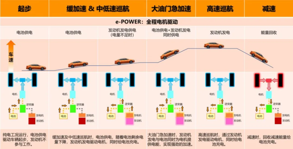 综合来看,e-POWER技术能够提供6种工况,满足不同场景下的动力需求。