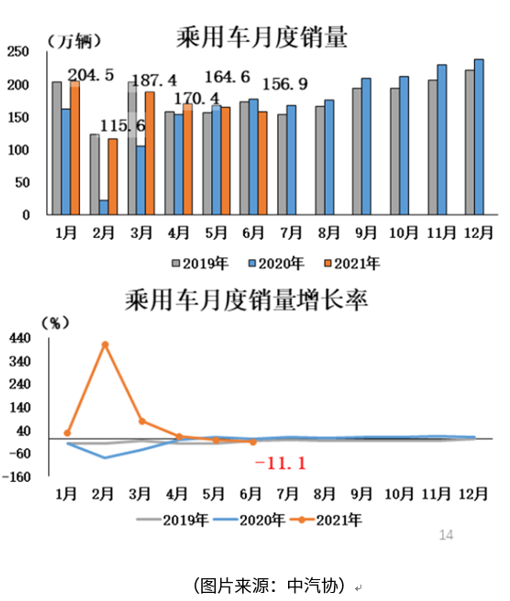 通过对2021年1-6月数据分析发现,国内乘用车1月销量同比增长26.8%至204.5万辆,2月销量同比暴涨415%至115.6万辆,增速创下历史新高。但由于“芯片荒”的广泛影响,众多车企宣布停工、停产,国内乘用车销量增速不断回落,5月起由正转负,汽车市场开始“受冷遇”。6月,乘用车的销量为156.9万辆,环比下降4.7%,同比下降11.1%。