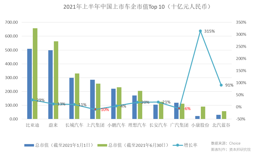 一、中国上市车企市场表现:比亚迪总市值稳居首席