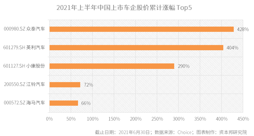 据Choice数据显示,2021年1-6月,国内上市车企股价涨幅最大的是众泰汽车,累计涨幅高达428%。涨幅最大的前五家中国车企均在A股上市。