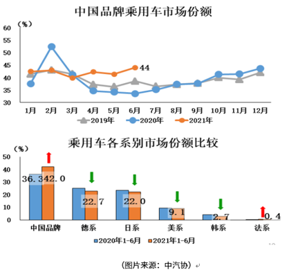 从乘用车各系别市场份额变化也看出,中国品牌越发被认可。受益于国内疫情迅速受控,中国品牌的销量逐渐与其他系别拉大差距,在中国市场上占据主导地位。2021年1-6月,中国品牌乘用车销量总计为419.8万辆,同比增长46.8%。期间,中国品牌乘用车的市场份额位居第一,达42%,同比上升5.7个百分点,较排名第二的德系乘用车高出19.3个百分点。