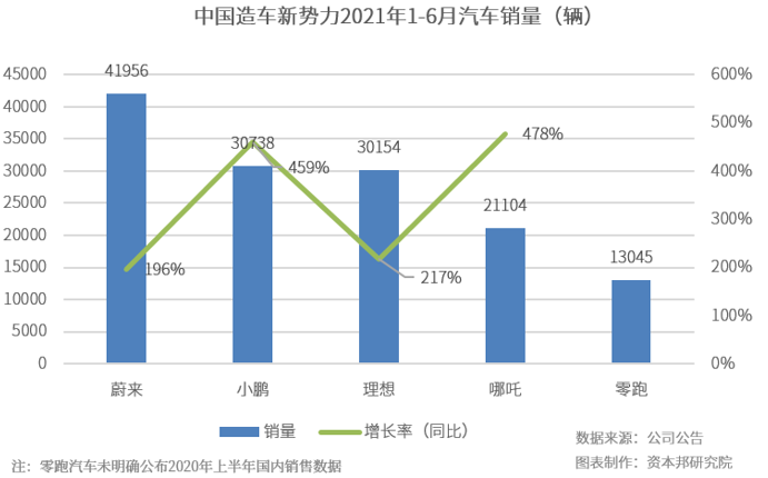 从中国造车新势力品牌来看,蔚来在今年上半年销量领先,达41956辆。小鹏和理想紧随其后,分别是30738辆和30154辆。零跑的销量目前垫底,为13045辆。