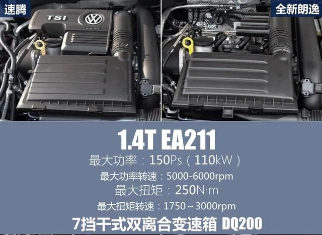 新款大众速腾匹配了全新的动力系统,1.2T7DSG和1.4T7DSG动力系统,大众最近几年的高端车型都使用了涡轮增压发动机+双离合变速器动力系统,1.2T发动机分为高低功率版本,高功率版的最大扭矩为200Nm,低功率版最大扭矩为175Nm,1.4T发动机的规格比较统一,最大扭矩均为250Nm,最大功率为150Ps,该发动机已经被应用至大众各个车型中,像朗逸、迈腾、帕萨特、途观L、探岳等车型。