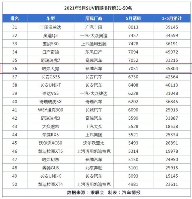 来看直观销量。如乘联会公布的2021年5月份SUV销量排行榜,大狗的单月销量为7051台,超过了同样主打个性化的长安UNI-T,排名榜单的第36位。不得不说,在大狗推出2.0T车之后,它的整体销量呈现了向上攀升的姿势。