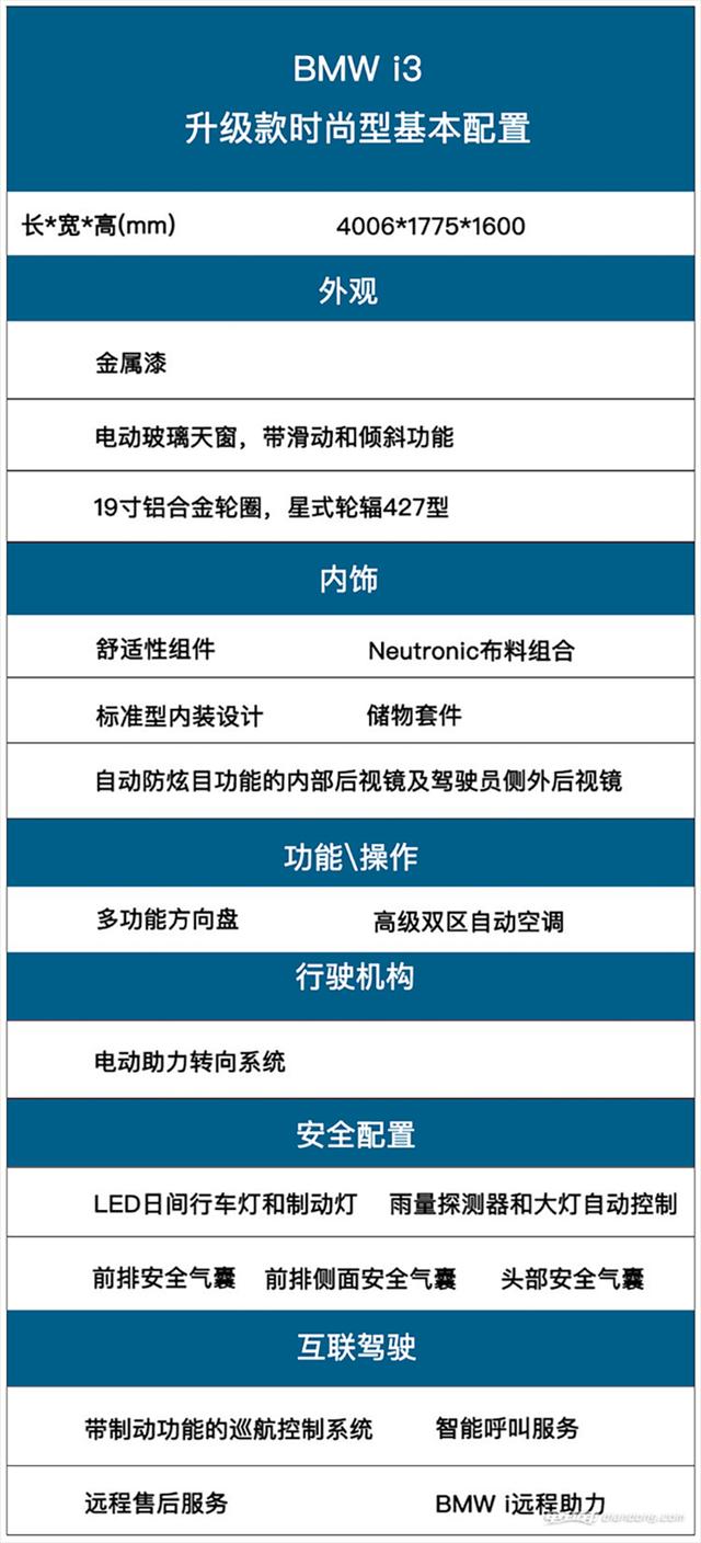 推荐理由: BMW i3升级时尚型,无论在细节还是用料上都诚意十足。200公里以上的续航里程,完全可以满足日常在城市代步的需求。加上丰富的配置,和不到30万元的价格使整车的性价比非常的不错。