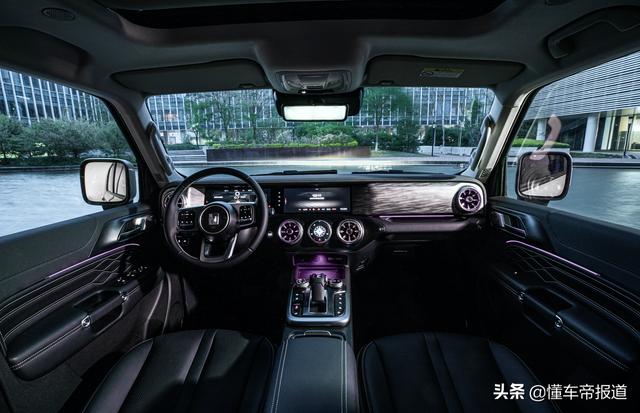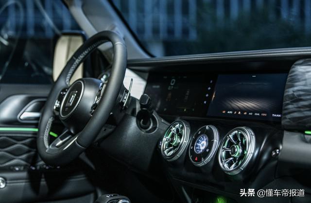 从内饰部分来看,坦克300城市版整体采用黑色配色,并换装全新纹路中控台饰板。同时,本次发布的官图着重突出了内饰氛围灯质感,预计在坦克300越野版顶配车型上出现的64色氛围灯有望成为标配。
