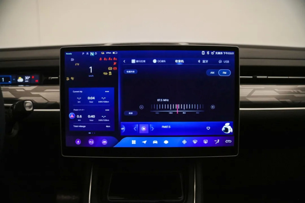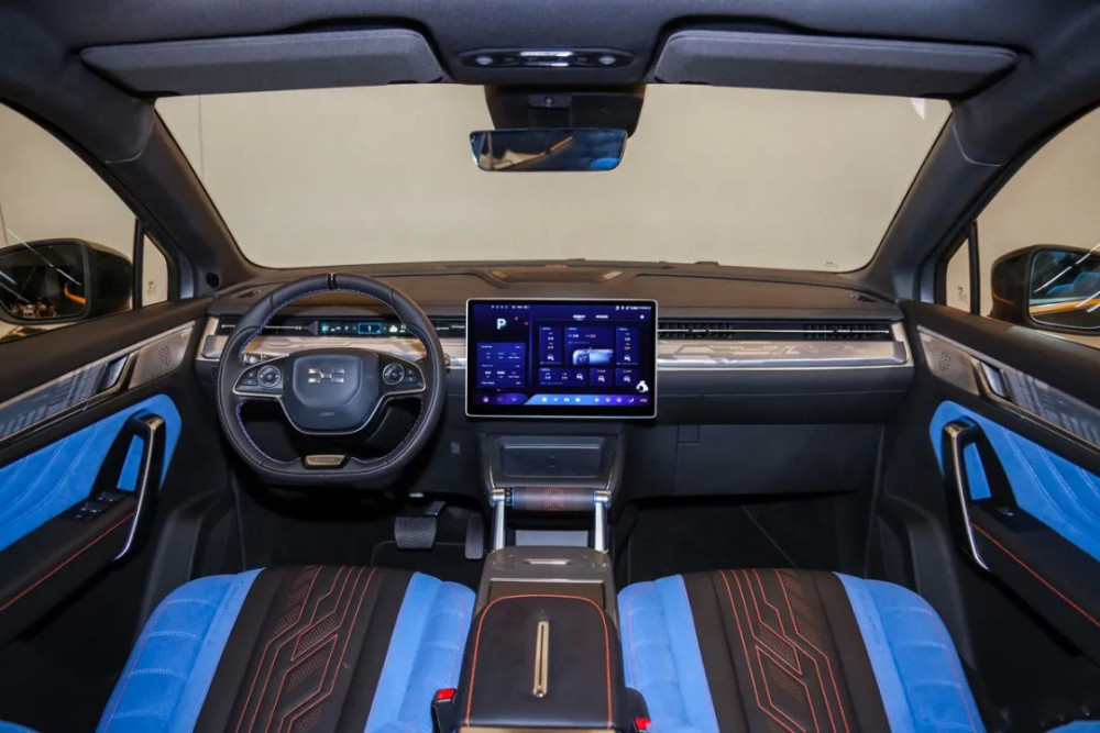 内饰方面,可以看到爱驰U6还是走着简洁的风格,这在新能源车型来说也是惯用的设计形式。不过爱驰U6也并没有过多地去追求多屏幕。而是将更多的显示级操作形式集中在中控台上的14.6英寸触控大屏,当然爱驰U6在传统仪表台区域设置了8.2英寸液晶仪表内嵌在空调出风口下方,显示功能也很全面,如剩余续航里程、挡位、车速以及外界气温等常用信息。