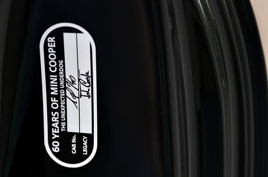 内饰方面,新车在车内的多处都增加了COOPER的标识,例如中控台、车门等处。并且在驾驶员一侧的门框位置,新车还悬挂有表明限量版编号的特殊铭牌,其上还贴有John Cooper的签名,极具纪念意义。