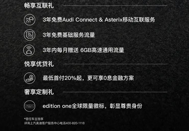 在销售政策方面,上汽奥迪将给予预订用户十六重预订专属权益来助力其新零售模式,涵盖了用户用车、出行、互联、金融等方面。包括可以上门取送车的终身免费深度保养等6项用车礼,同城不限公里数免费代价服务等6种自选兑换等出行礼,3年含免费移动互联服务、基础流量和高速流量的互联礼,以及在购车方面提供的20%低首付0息或低息优贷礼。