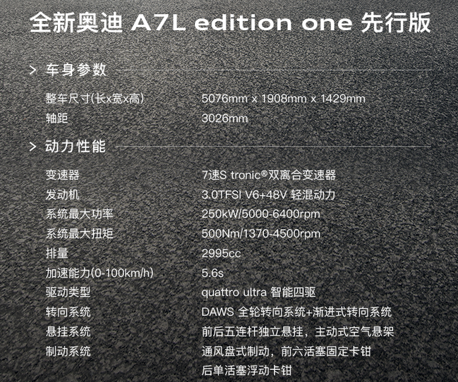 上汽奥迪将A7L定位奥迪国产最高级别的轿车,在硬件方面自然不能吝啬。新车先期将搭载进口的3.0TFSI V6涡轮增压发动机+48V轻混系统,最大功率250千瓦,峰值扭矩500牛·米,匹配7速双离合变速箱,百公里加速时间5.6秒。悬挂系统采用前后五连杆结构,并配备主动式空气悬架、动态全轮转向和quattro ultra智能四驱系统。