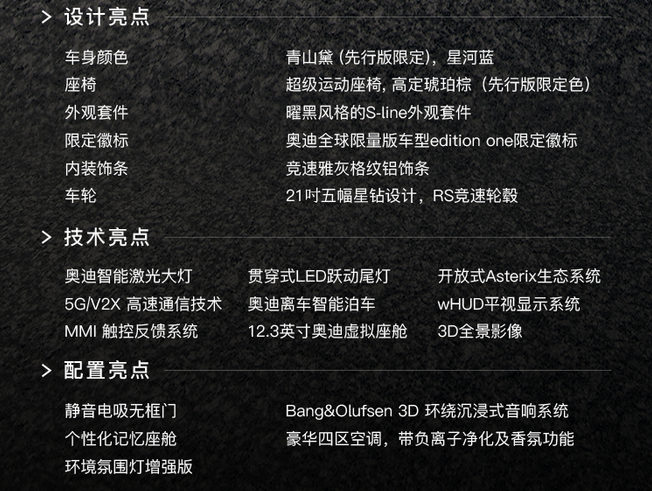 内饰部分,先行版将提供版B&O 3D环绕式音响、带香氛和负离子净化功能的四区空调、环境氛围灯增强版以及运动座椅,在技术装备上,除了5G/V2X高速通信、wHUD平视显示系统、离车智能泊车,奥迪虚拟座舱外,开放式Asterix生态系统是比较大的亮点。