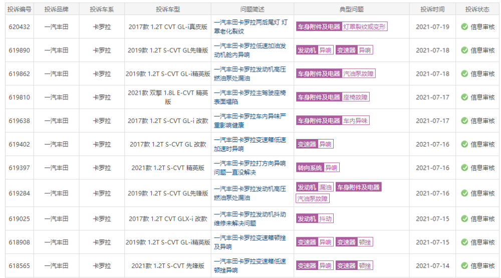 接着我们再来看一下一汽丰田的卡罗拉车型,卡罗拉的投诉车型也集中在这几年的新车,其中2019年,2021年以及2017年的投诉故障率是最高的。投诉率相对来说比较的简单一些,绝大部分都是车身附件以及电器的故障,其中还有变速箱异响,顿挫现象也是比较的明显,没有出现发动机熄火的投诉。