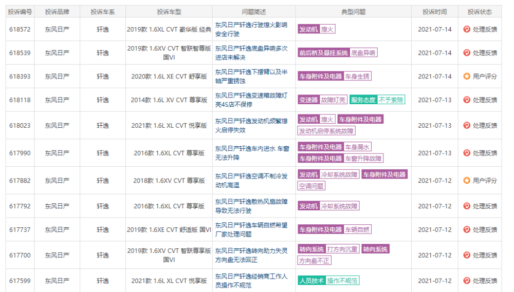 我们先来看一看日产轩逸车型,大部分投诉车型都是在19年,20年,21年左右的车子,投诉率主要集中在车身附件以及电器,发动机熄火,冷却系统故障。其中发动机熄火的现象是比较多的,而且电器元件故障率也是比较高的。