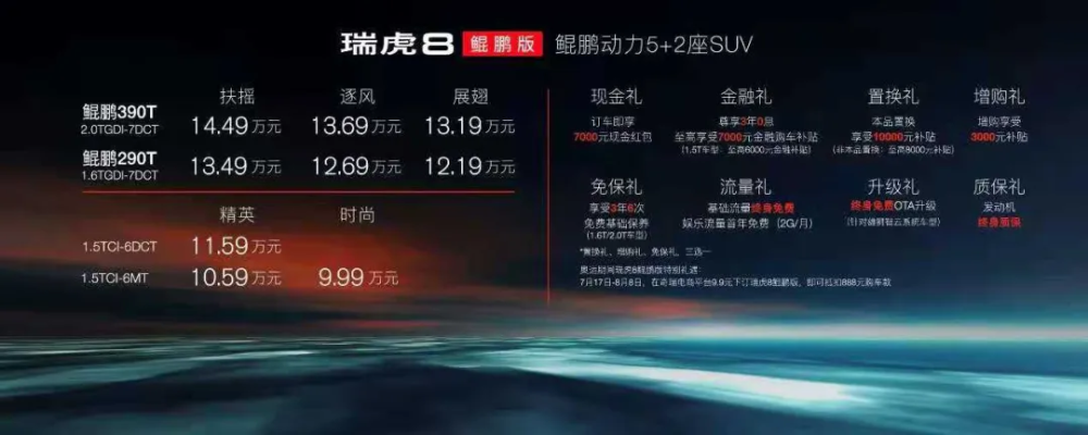 7月17日,搭载最新发动机技术的瑞虎8鲲鹏版正式上市,新车共推出9款车型,官方售价9.99万元-14.49万元。