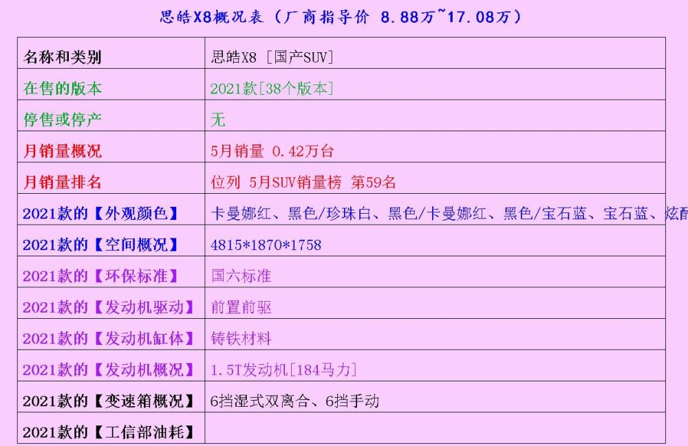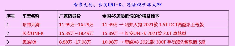 上面分享给诸位的这些SUV车型里,其中指导价最低的SUV是思皓X8,再者是哈弗大狗,价格相对最高则是长安UNI-K,它们的价格是8.88万、11.99万及15.39万。值得关注的是,许多情况下指导价和落地价的差距还是蛮大的。经查证后得知,哈弗大狗、长安UNI-K、思皓X8的国内最低的裸车价分别低至11.49万、15.39万和10.08万。很快又来到本文的尾声啦,不知您看中哪一款呢?最后衷心祝列位鸿运当头、万事无忧。
