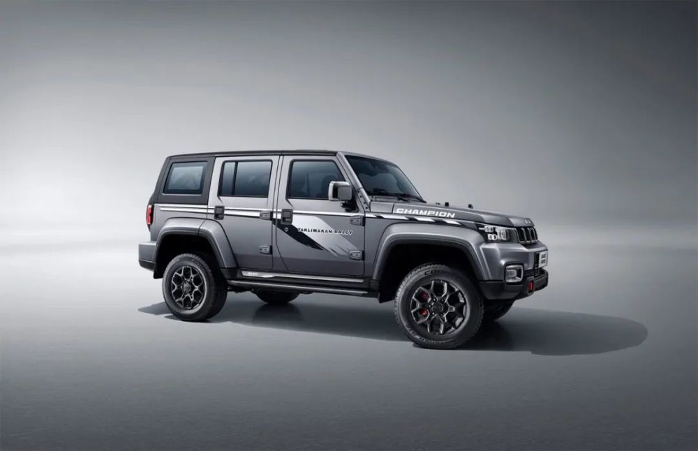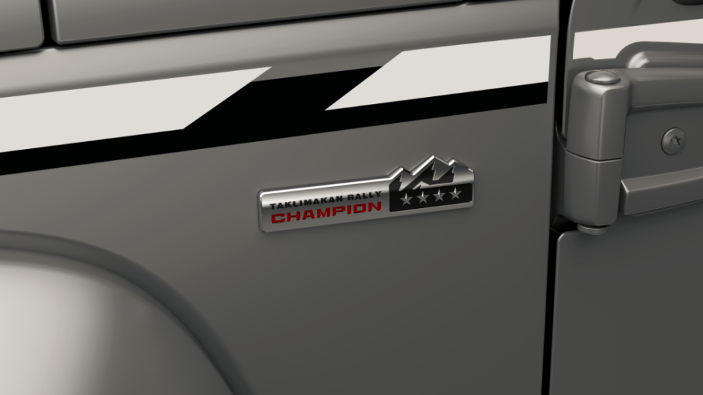 车停着,也带着塔漠的风;在这“暴风”中,又有着一波接一波的惊喜。新一代BJ40环塔冠军版车门上的专属拉花、冠军徽标,硬朗、稳健,配合“TAKLIMAKANRALLY”字样,冠军身份耀眼;调转目光,酷黑格栅和酷黑轮辋,将越野的潮酷进行到底,不惧剐蹭的特性,让人可以放开手脚尽情去野;辉煌星级备胎罩以塔克拉玛干沙漠中的景观——远山和胡杨为设计灵感,下方绘有“TAKLIMAKAN RALLY”、“CHAMPION”、四颗星以及“北京”红色LOGO的搭配,提升车尾品牌识别度。