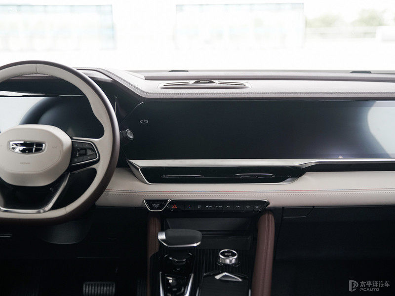 内饰上,新车采用了与现有吉利截然不同的设计风格,全新的长度约100cm的“贯穿式”中控屏设计(中控屏+副驾娱乐屏),进一步彰显了其科技感;而下方电子排挡处似乎借鉴了不少源自领克的菱形元素。同时中控台采用的是双拼色设计,相比霸气的外观多了一分韵味,整齐的缝线工艺与细腻的材质用料尽显与众不同。