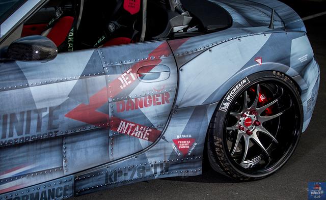 这是一辆改装超“凶猛”姿态的宽体宝马Z4,外观部分,全车采用Liberty Walk碳纤维车身套件,搭配W-WORK CR Kai 2P轮毂和AP Racing Radical前六后四制动卡钳,性能动力部分,这辆宽体宝马Z4换装Airrex气动套件,Airlift 3H气动控制系统以及ARC碳纤维防倾杆,内饰部分,则选用碳纤维+ Alcantara车门,M Performance方向盘,M Performance换挡杆,Tecnocraft座椅和Takata安全带。