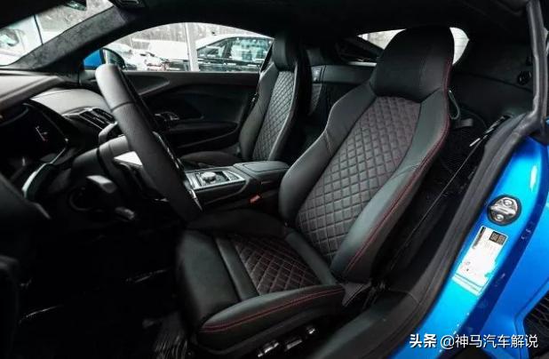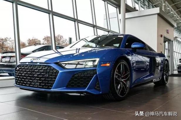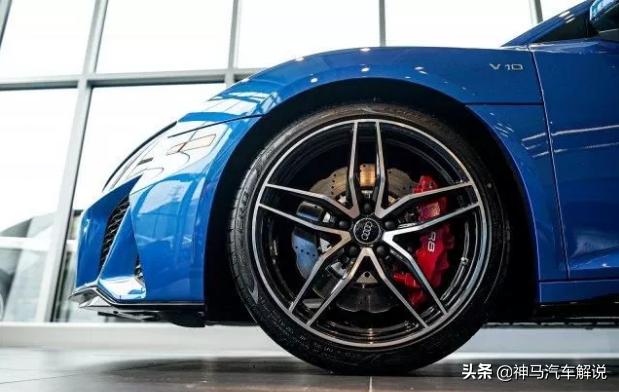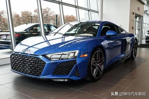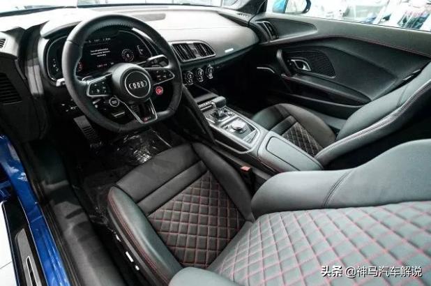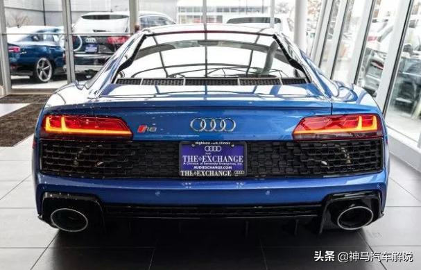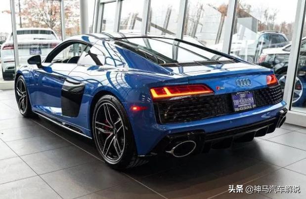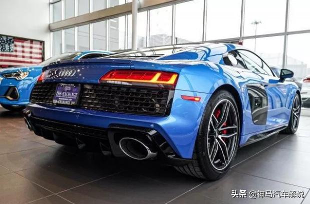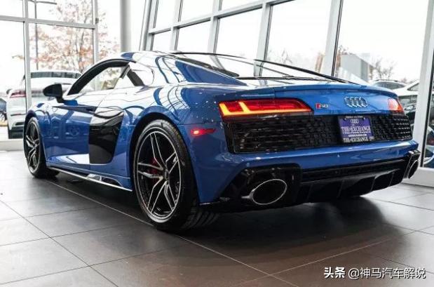 2020款奥迪R8,海外实车,前脸采用家族式的最新设计语言,大嘴格栅非常有辨识度,中网蜂窝状的设计非常运动,发动机盖上的线条非常锋利,大灯造型很有神韵,前保险杠造型复杂。侧面低矮的车身非常有冲击性,车顶轮廓流畅舒展,腰线很有力量感,车门凹面精致,大尺寸的轮毂造型简洁,红色卡钳很有运动气息。尾部造型优雅时尚,尾灯造型精致细腻,排气设计运动。内饰设计简洁运动,三幅式的平底方向盘,车内按键布局简洁,座椅设计运动。