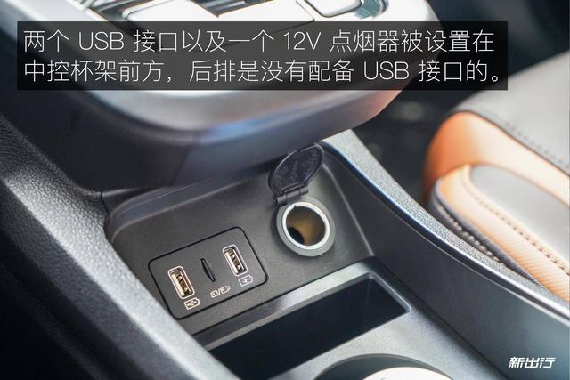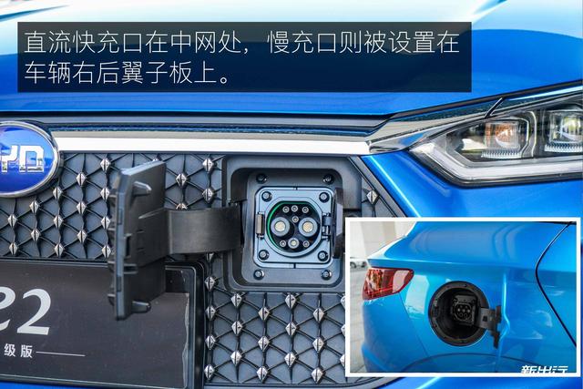 e2 车型上的直流快充口位于“满天星”中网内,隐藏的比较深,不容易发现。打开方式较为简单,按压后盖板既能弹出,而交流满充口被设置在车辆右后翼子板上。充电时间上,最大支持 40kW 的充电功率。