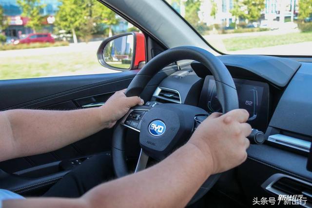 转向部分,比亚迪 e2 的方向盘很轻,这台车在城市里面开起来非常轻松,加上小巧的车身尺寸,用来城市驾驶代步非常的合适。当然了,作为一款家用车,方向盘会有一定的虚位,同时也别期望它能给你带来丰富的路感信息,轻松好开,才是它的本职工作。