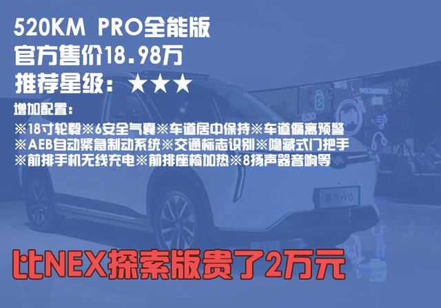 520km PRO全能版,官方售价18.98万,比NEX探索版贵了2万元,增加配置包含:18寸轮毂、6安全气囊、车道居中保持、车道偏离预警、AEB自动紧急制动系统、交通标志识别、隐藏式门把手、前排手机无线充电、前排座椅加热、8扬声器音响等。