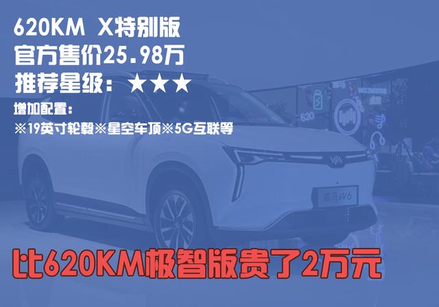 620km X特别版,官方售价25.98万元,比620km极智版贵了2万元,增加配置包含:19英寸轮毂、星空车顶、5G互联等。