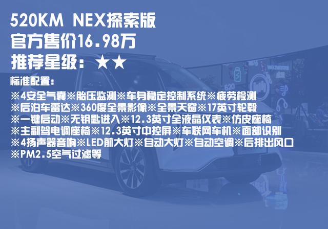 520km NEX探索版,官方售价16.98万,标准配置包含:4安全气囊、胎压监测、车身稳定控制系统、疲劳检测、后泊车雷达、360度全景影像、全景天窗、17英寸轮毂、一键启动、无钥匙进入、12.3英寸全液晶仪表、仿皮座椅、主副驾电调座椅、12.3英寸中控屏、车联网车机、面部识别、4扬声器音响、LED前大灯、自动大灯、自动空调、后排出风口、PM2.5空气过滤等。