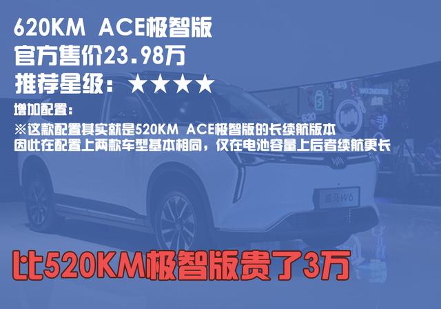620km ACE极智版,官方售价23.98万元,比520km极智版贵了3万。通过配置名可以看出,这款配置其实就是520km ACE极智版的长续航版本,因此在配置上两款车型基本相同,仅在电池容量上后者续航更长,但价格上涨3万元,值不值?还要看你自己的选择了。