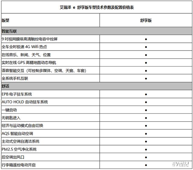 在智能化配置上,艾瑞泽e全系标配了9英寸触控大屏,舒享版比入门车型多出了全车全时极速4G Wifi热点、在线音乐、新闻、实时在线GPS高精地图导航、语音智能交互等智能配置,跟顶配车型的功能保持一致。