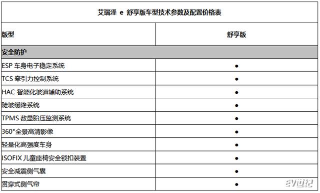 安全配置总结:艾瑞泽e对安全的重视程度,使三款车型之间在安全配置上的差异并不大,做到了入门即高配。但舒享版在安全气囊的数量上,依旧拥有不小的优势。