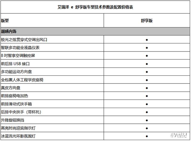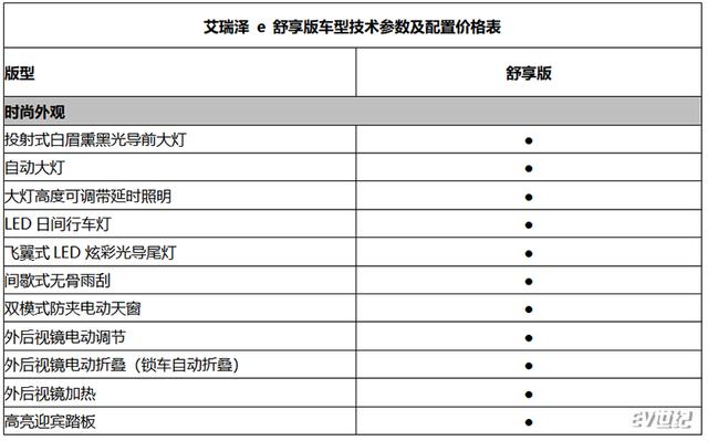 在艾瑞泽e推出的三款车型中,舒享版不管是在外观、内饰的差异化配置,还是在智能、安全等方面的配置,都很好的满足了人们对车辆更高的出行需求。且从价格来看,舒享版仅比入门版车型贵了3000元,但多出的配置实用性却远远超出了费用范畴,是艾瑞泽e车型中首选的高性价比车型。