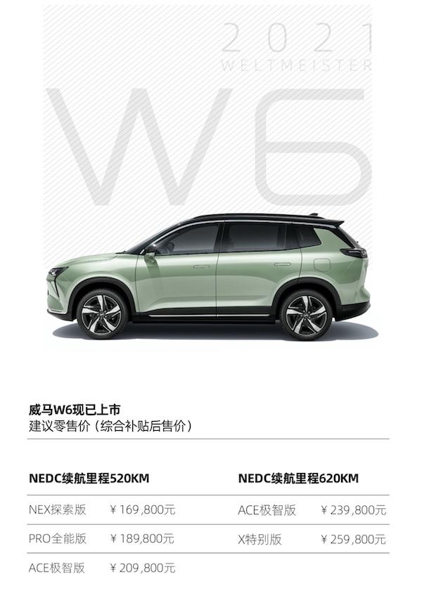 显然,威马汽车自然也了解自身处境,而想要打破这个困局,最有效的方法就是通过发布新产品来让市场关注度重新集中在自己身上。因此,来到2021年,威马为我们带来了首款中型SUV-威马W6。新车于3月1日开启预售,也于今日正式上市,并计划在上海车展开始交付。