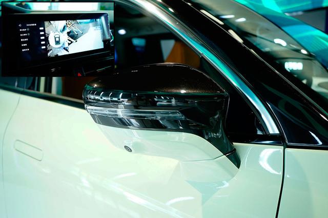 外后视镜采用车身同色底座+黑色外壳拼接,与为双色车身风搭配,不过壳体看起来有些笨重。设有LED侧转灯和侧置摄像头,摄像头布置地也较为平整,360°全景影像为全系标配。外后视镜支持电动调节、折叠、加热、锁车自动折叠功能,高配车型增加记忆和倒车自动下翻功能。