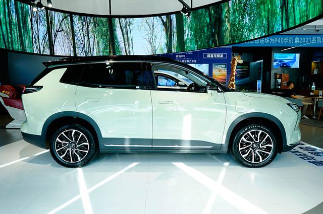 侧面来看,较短的前后悬垂和厚实的车身是典型的电动车布局风格,车身整体高度很充分,车窗下沿上提、高度被压缩,D柱并没有之前的EX5那样倾斜,整体造型略显方正。细节方面,采用了无特征线条的腰线,让大面积车身看起来格外圆润,抵消了整体造型的方正感。采用了暗色车顶和立柱,再加上后排隐私玻璃,强化了双色的对立效果。