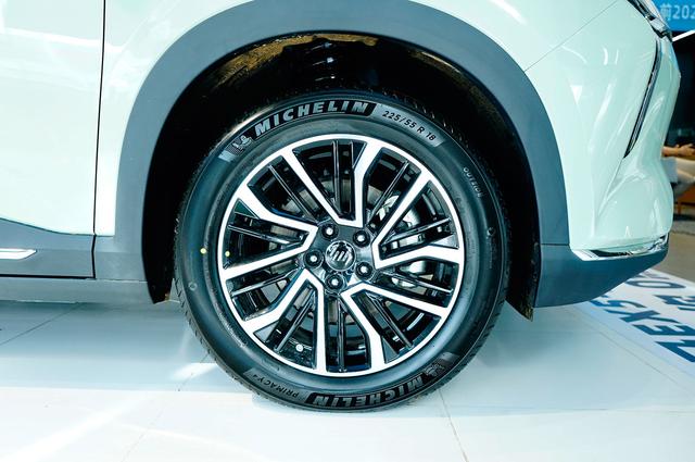 前后轮提供17、18和19英寸三种规格,这台车为适中的18英寸,规格均为225/55 R18,尺寸与车身比较协调。采用了不规则多辐式双色轮毂,与双色车身也算匹配。搭配米其林Primacy 4浩悦轮胎,在保证静音性的前提下,提升了湿地制动性能,安全性有所提升。