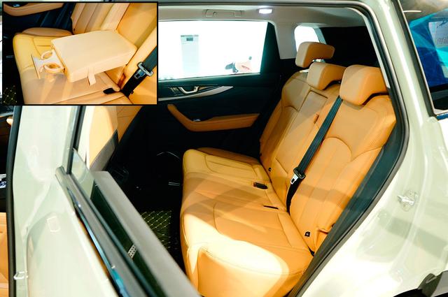 后排座椅同样采用棕色仿皮包裹,坐垫有一定的倾斜度,带来重心靠后的微躺坐姿,靠背支撑多级角度调节,拥有充裕的承托力和良好的适应性,还有少许的侧向支撑,整体的舒适度不错。空间方面,侃弟身高175cm,腿部空间两拳半,头顶有一拳半的空间,整体表现较为出色。后排配备三个独立头枕、带两个水杯架的翻折扶手。