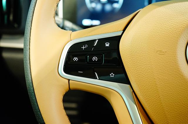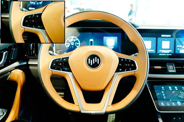 三辐式多功能方向盘采用了黑棕双色皮质包裹,采用烤漆面板和镀铬点缀,看起来非常上档次。方向盘直径合适,握感饱满,横辐上采用按键控制,也比较容易上手。