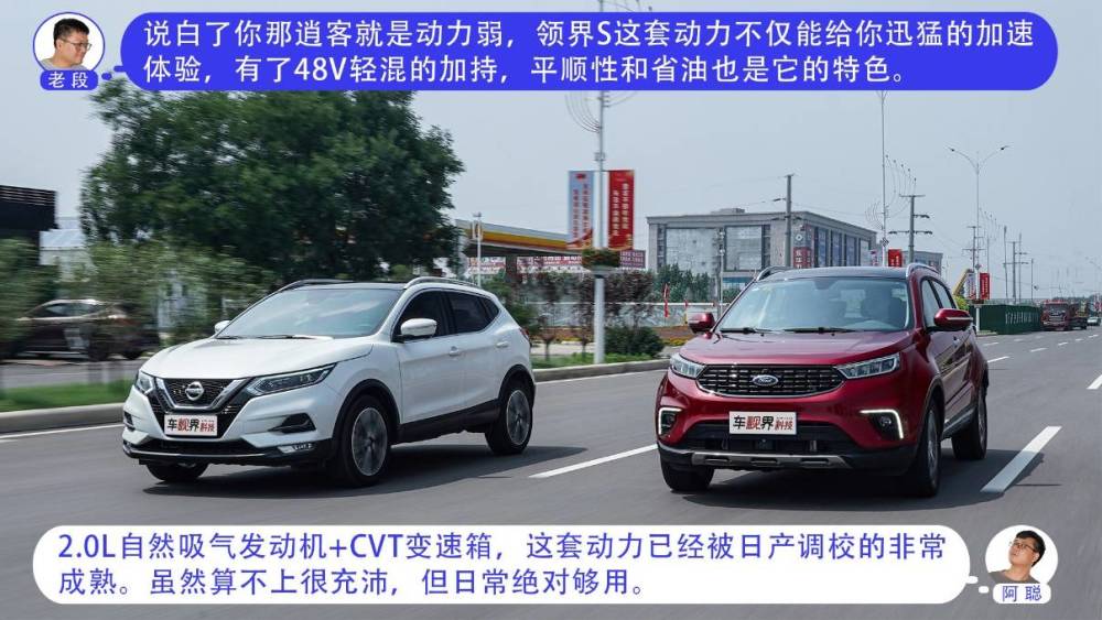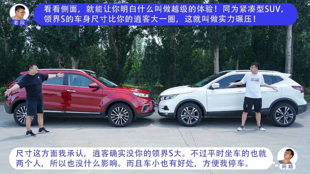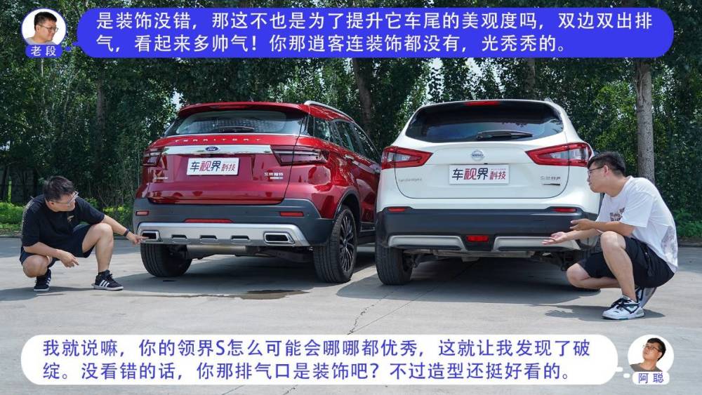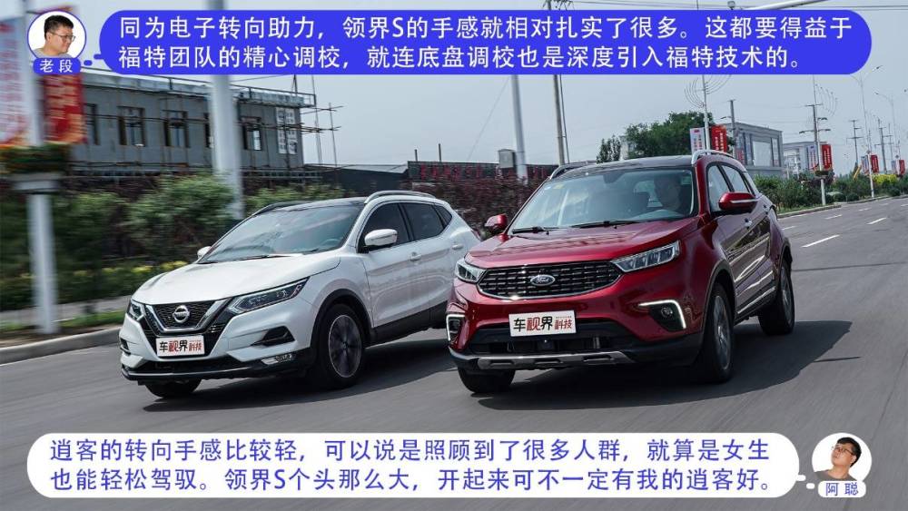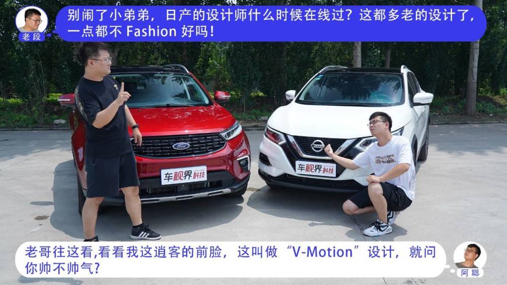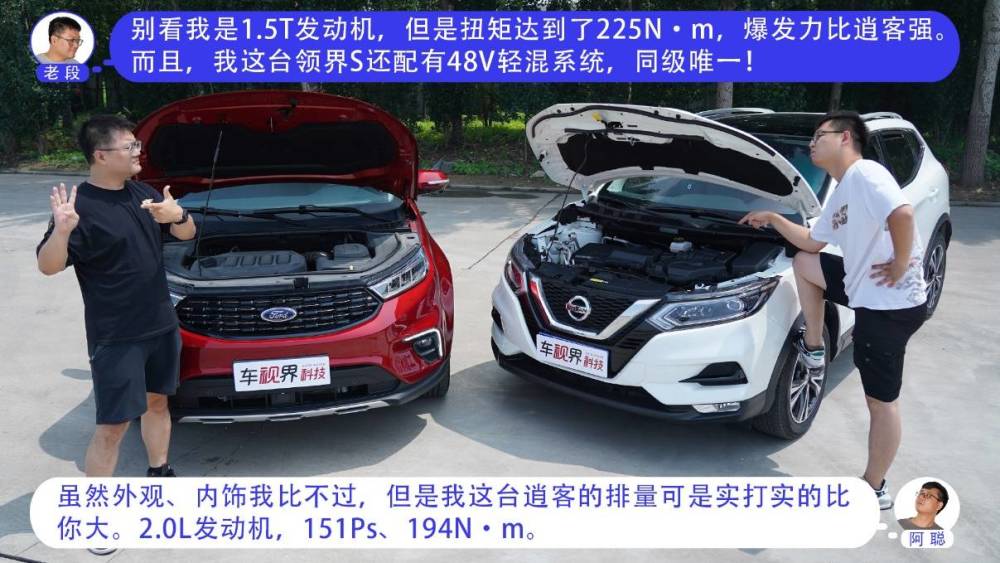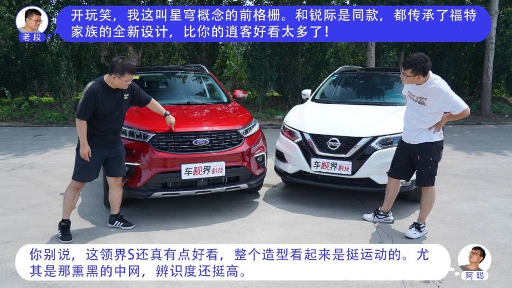 其实领界S和逍客都是紧凑型SUV中比较热门的车型,福特领界S是一台具有明显运动感和人性化科技的车型,逍客在国内沉淀多年,有着老少皆宜的外观。我们就来看看,老段的全新福特领界S 48V尊领型PLUS(指导价为16.48万元),和阿聪的东风日产逍客2021款2.0L豪华版(指导价为16.88万元)会产生怎样的火花。