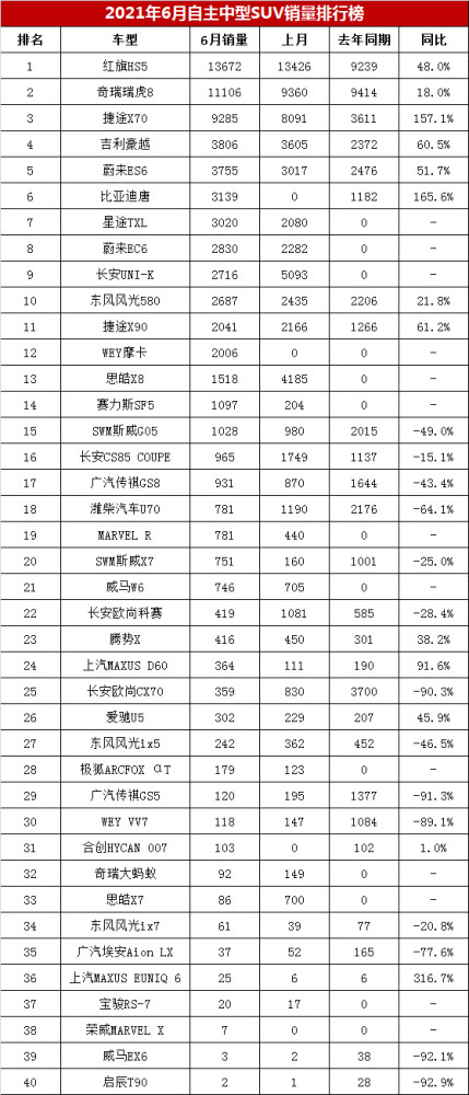 【2021年6月国产自主中型SUV销量排行榜】相比合资品牌而言,全球芯片紧缺对自主品牌的影响似乎要小得多,因而今年6月自主中型SUV市场销量继续保持增长势头。据购车网编辑日前整理统计显示,2021年6月自主中型SUV市场批发销量为7.16万辆,同比增长38.9%,销量增加了2万辆;与5月份相比,销量小幅增长4.0%。下面,我们一起去看看今年六月国产自主中型SUV批发销量及其排名情况: