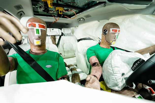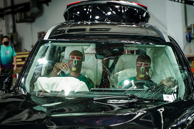 本次高速车对车碰撞试验模拟的是车辆越过中间线与对向行驶的车辆发生正面碰撞的事故形态,可以真实反映车辆发生类似交通事故时对车内乘客的保护效果。作为一种非标准的碰撞工况,对车辆的约束系统响应和车身结构强度提出新的挑战,可以更好的检验车辆安全性和可靠性。单车时速高达64km/h,更加真实的模拟现实生活中的车辆碰撞事故。