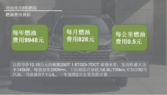 以指导价12.19万元的鲲鹏290T 1.6TGDI-7DCT 展翅来看,发动机最大功率145kW,峰值扭矩290N•m,工信部综合油耗为6.9L/100km,可加注92号汽油,当前油价7.1元/L,一年按照2万公里里程计算,这样我们可以算出奇瑞瑞虎8鲲鹏版每年的燃油费用在9940元左右,每公里燃油费用大约为0.5元。