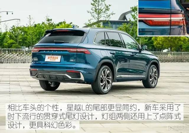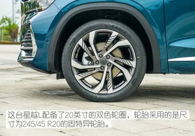 为了让整个车身侧面更显饱满,这台星越L配备了20英寸的双色轮圈,轮圈的辐条上还用上了类似刀刃的设计,更显个性。